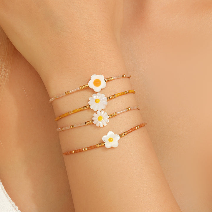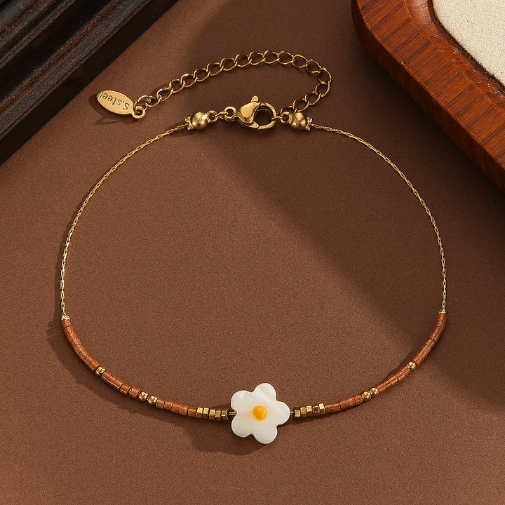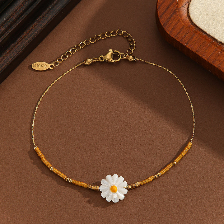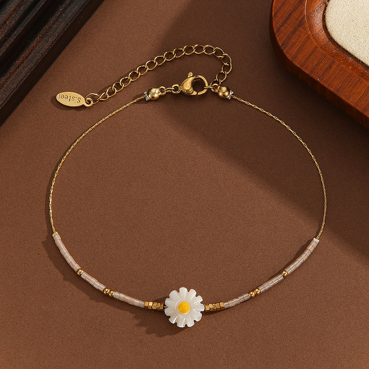 Tiny daisy-inspired seed beads on titanium steel, versatile as both anklet and bracelet. Brings cheerful, sunny, and natural vibes to your look.