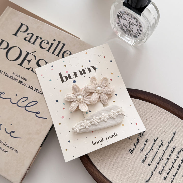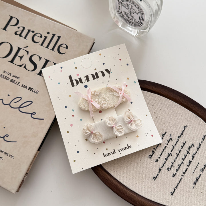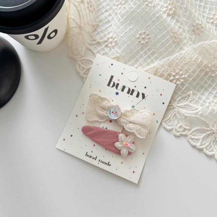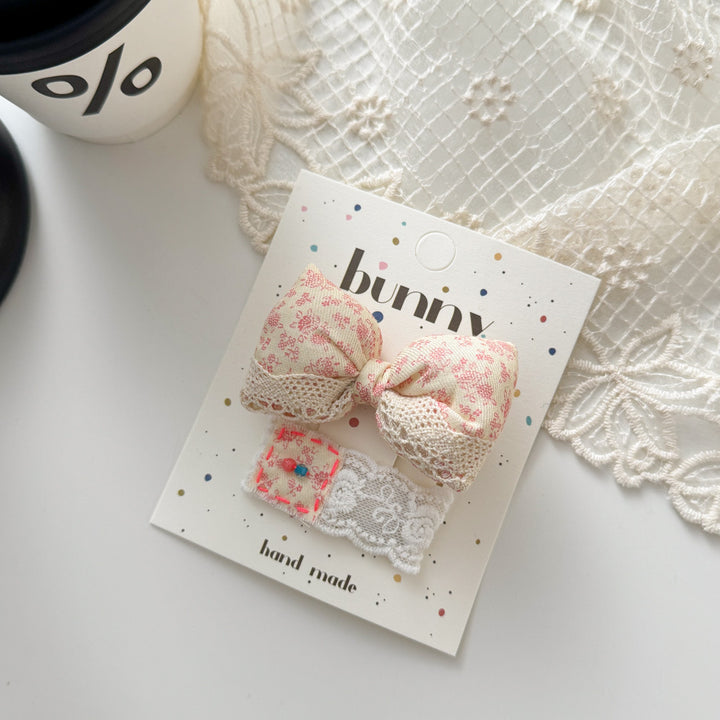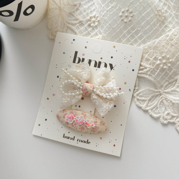 Romantic lace and floral fabric bows paired with pearl and heart accents for a sweet seasonal vibe.